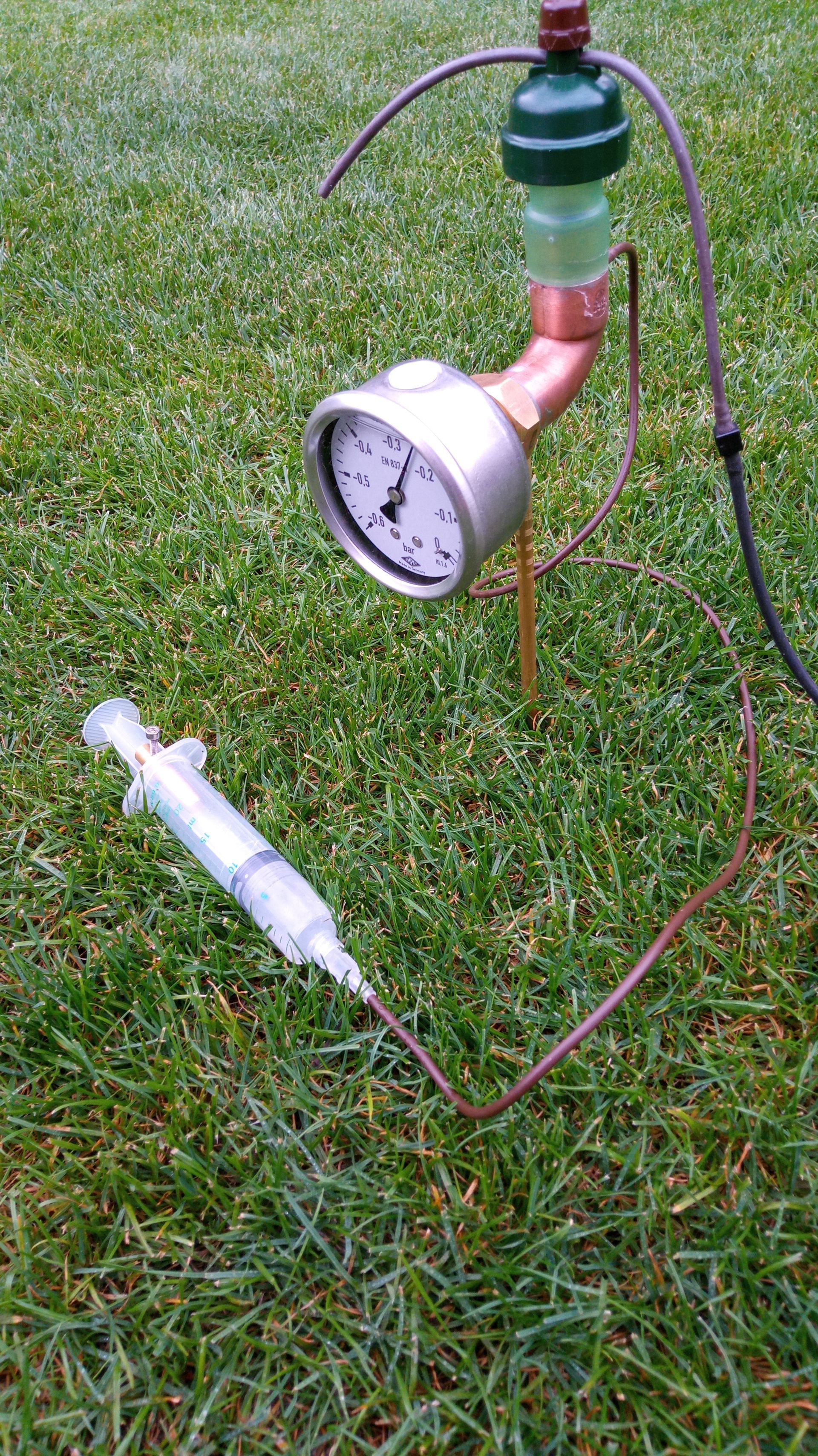 Der einzustellende Tropf Blumat Kopf wird auf das mit Wasser gefüllte Einstell- und Prüfgerät geschraubt. Dann wird über die BBraun Spritze der gewünschte Unterdruck (z.B. -130mbar) eingestellt. Der Silikonschlauch des Tropf Blumats wird an die Bewässerungsleitung (Druck ca. 1,0 bar) angeschlossen. Anschließend wird der Einstellknopf am Tropf Blumat so eingestellt, dass er gerade nicht mehr tropft. Die gefundene Einstellung dann markieren.